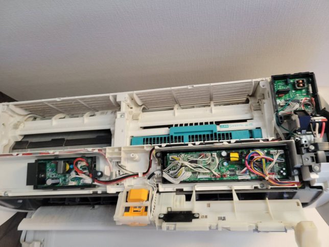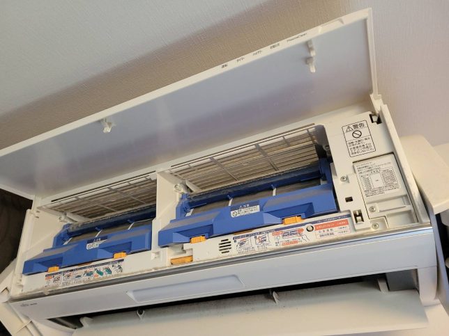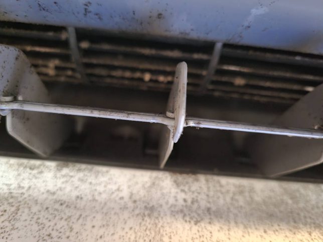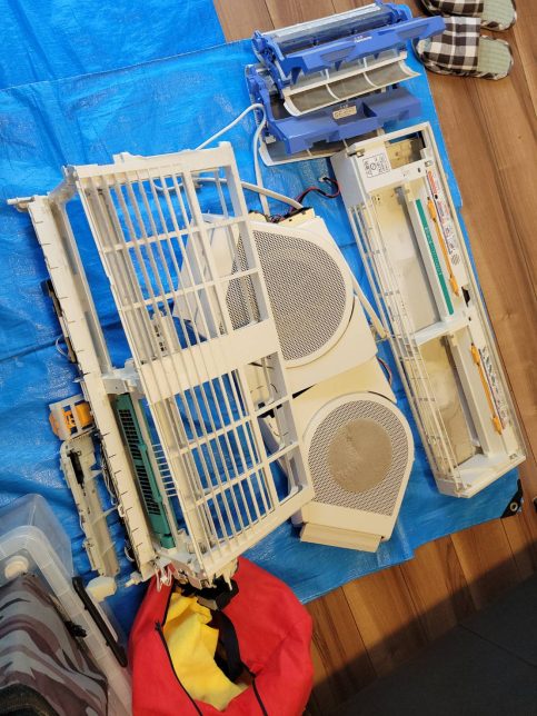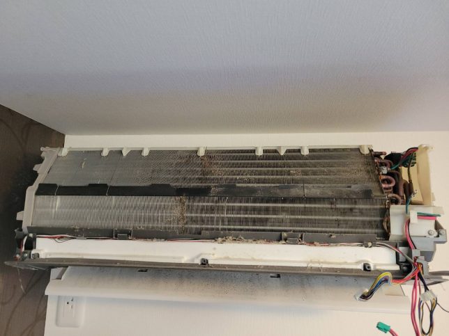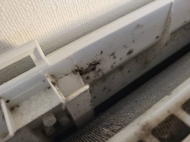 リビングのエアコンなのでキッチンの油やカビでかなり汚れています。