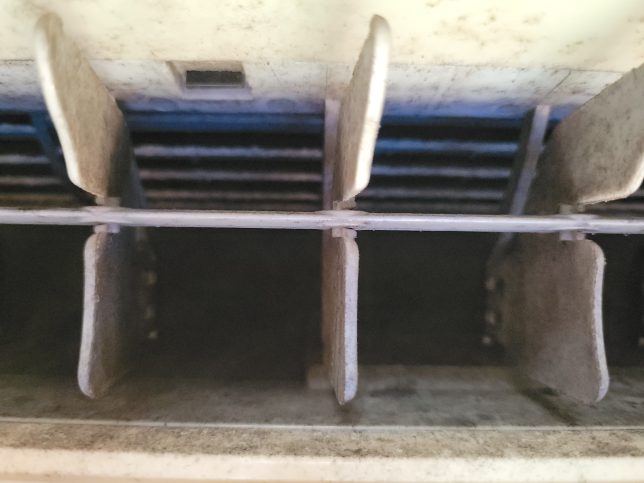 送風ファンを手で押さえて洗浄しないと高圧洗浄の勢いで汚れが奥まで飛び散ってしまいます。