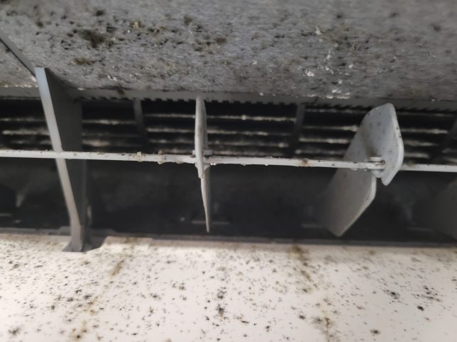 フィルターが動いた際に細かいホコリがパラパラとアルミフィン側に落ち