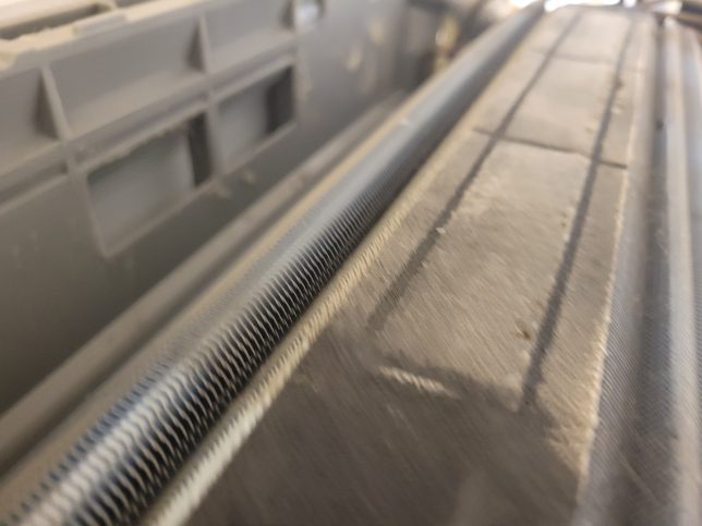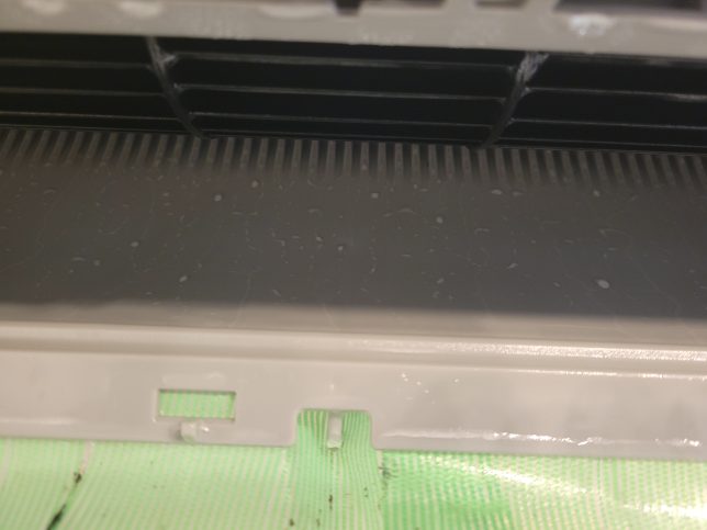 フィルター自動掃除の際の振動で細かいホコリがすり抜けてアルミフィンに降り落ちます。