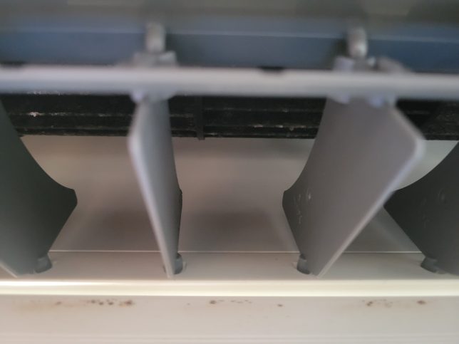 カビはあまり目立ちませんが、クーラー使用時の湿気とホコリを栄養に広がってはいます。