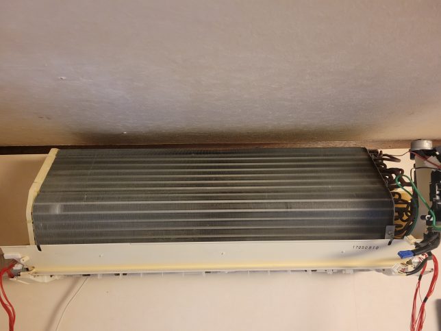 天井とのスキマはほぼないので、アルミフィンの奥側は鏡を使って確認しながら洗浄しました。