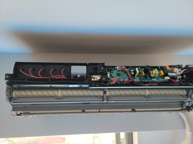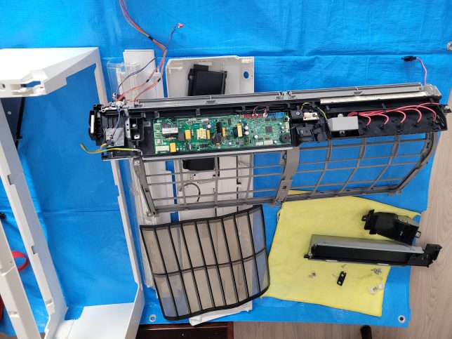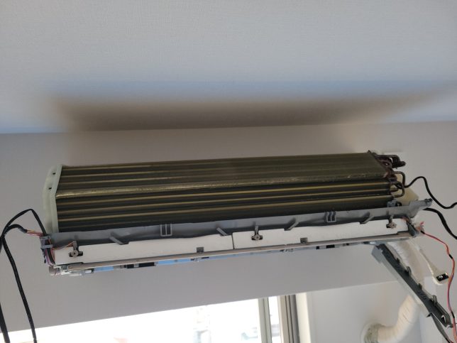 お掃除ユニットがアルミフィンを隠していますが、隅々まで洗浄するためにお掃除ユニットを外します。