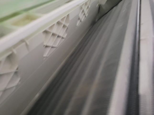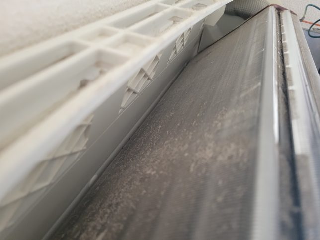アルミフィンの奥側も同じようにホコリやキッチンからの油で汚れています。