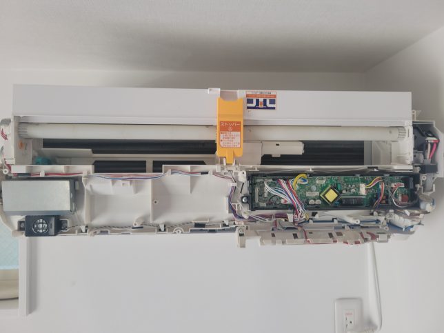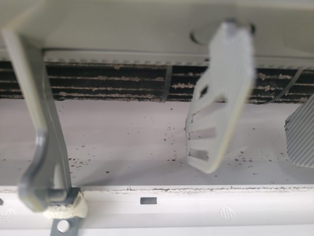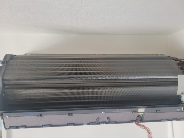 お掃除ユニットがアルミフィンの大部分を覆う構造で、分解をしないとアルミフィン全体が洗浄できないのは従来機と同じです。