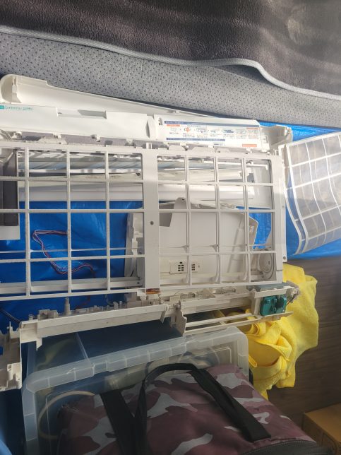普段はみえない部分のアルミフィンの奥側も鏡を使って確認しながら汚れを落とします。