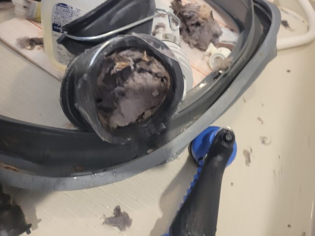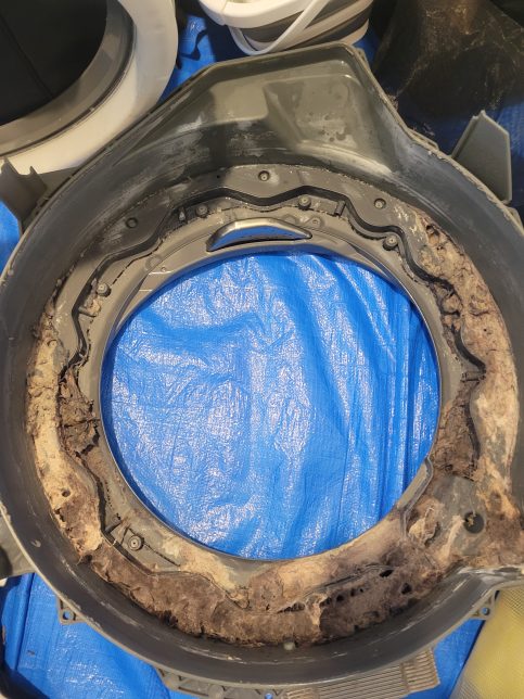脱水受けカバーに溜まったホコリは洗剤カスと混ざって固着しています。