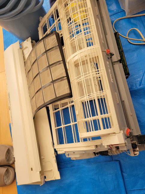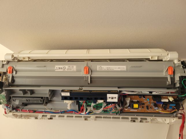 高機能エアコンなので基板と配線が多く芸術作品ともいえる構造です。