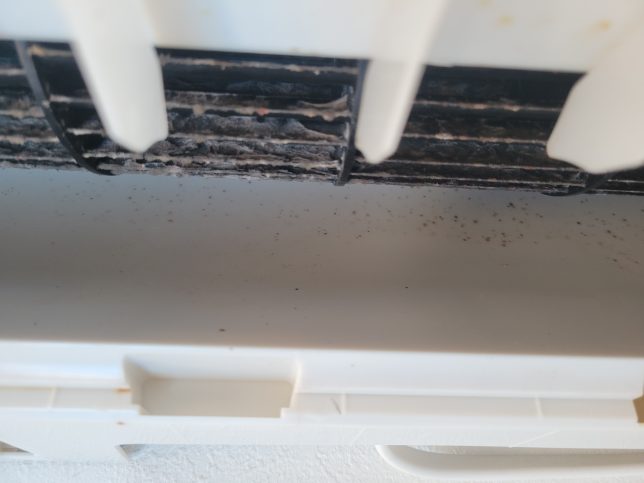 今回はこの送風ファンの汚れが気になってブラシで一部を擦ったら、それ以降運転中に黒いカスが降ってくるようになったとのことで今回のご依頼となりました。