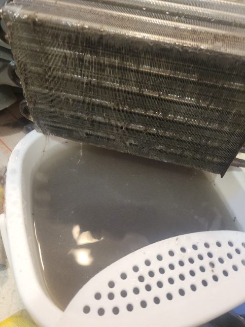 表面のホコリと、洗浄時に出てくる写真の排水のような細かいホコリが熱の伝わるのを邪魔してしまいます。