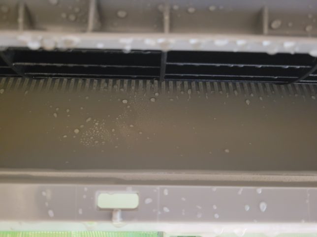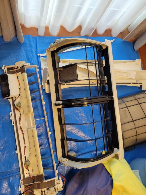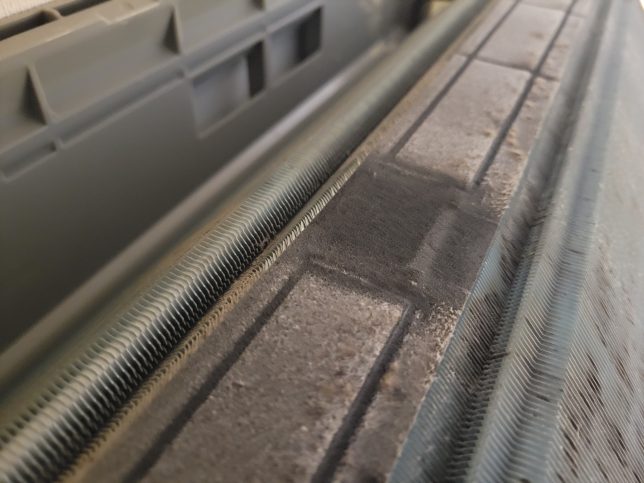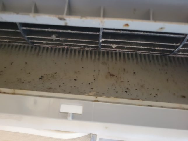フィルターを通り抜けたホコリで、夏場の結露で増殖したカビ、キッチンからの油はアルミフィンの奥にも広がっています。