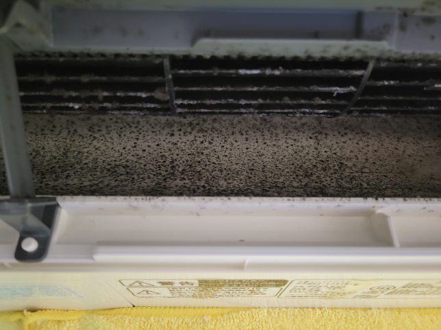 夏場は結露が続いてカビが繁殖しやすい環境になるため、カビとホコリが絡み合って黒い斑点や塊として吹出口に現れます。