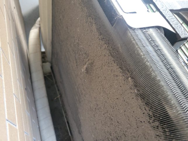 室外機のアルミフィンが洗濯物のホコリで覆われていた例