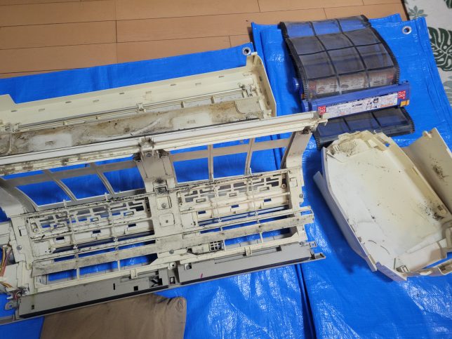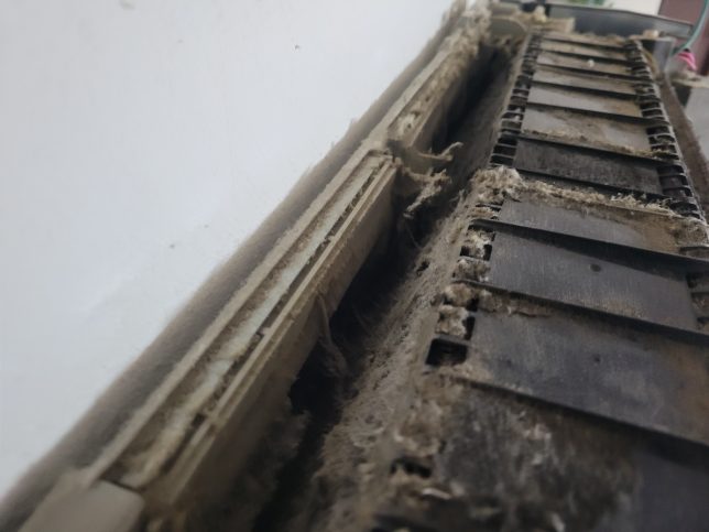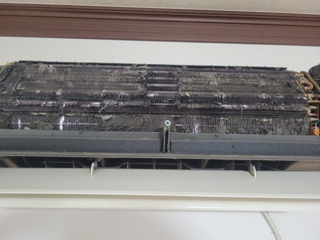 カビやキッチンからの油のほかに、自動お掃除で動くフィルターから落ちたホコリが溜まってアルミフィンを覆っています。