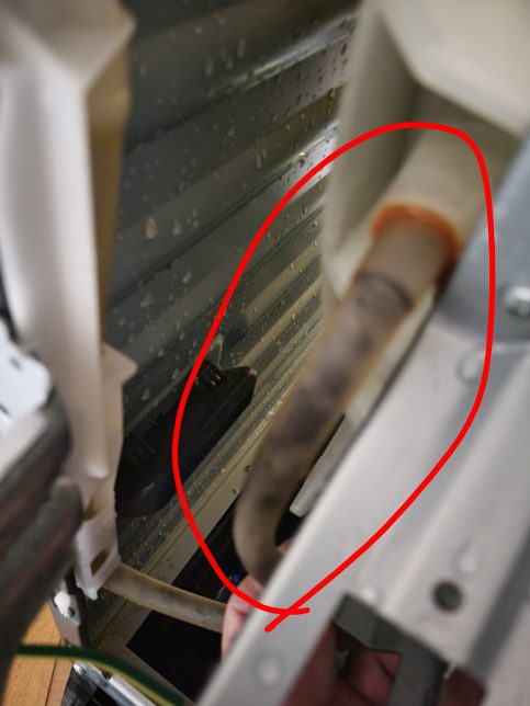 その水を排水するドレンホースが汚れで詰まると、内部に水が溜まってヒートポンプが冠水します。