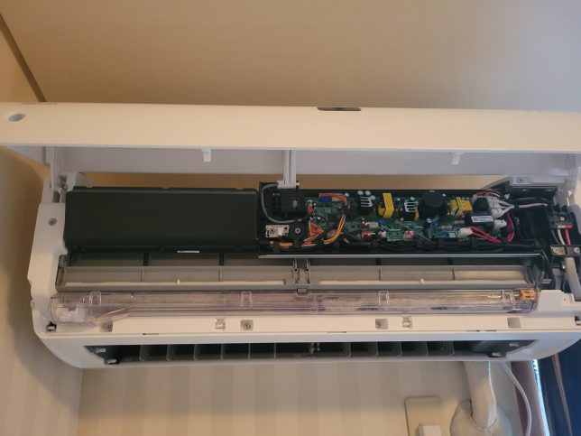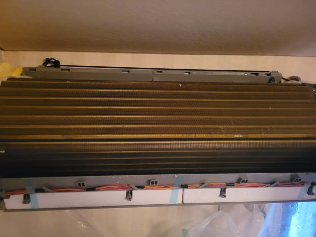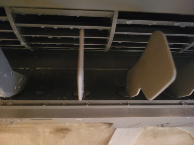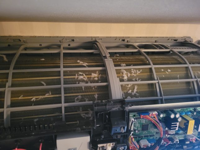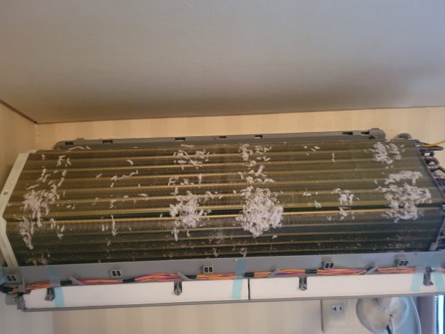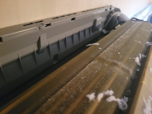 ホコリがあることで風の通りが悪くなり、熱交換率が下がって無駄に電気代がかかる状態です。