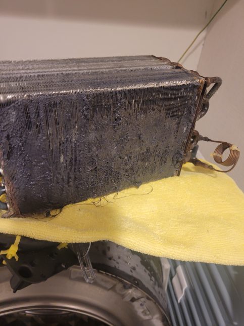 ホコリで風が通らなくなるとアルミフィンが直接空気に触れないため、除湿ができなくなります。