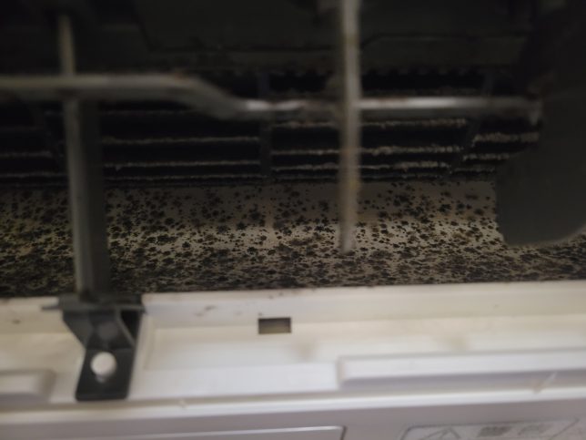 アルミフィンの奥にもカビが広がっています。