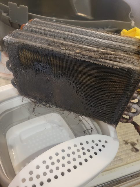 ヒートポンプは空気中の水分を回収して結露水を作りますが、その排水経路に糸くずやホコリが蓄積すると水が流れずにケース内に溜まってしまいます。