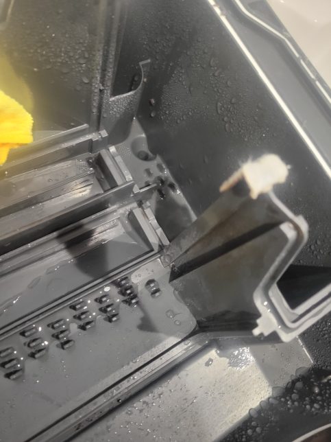 細長いブラシを入れて汚れをずらして解消することが多いですが、それでも直らない場合は洗濯機を手前に引っ張り出して後ろからのアクセスが必要になります。